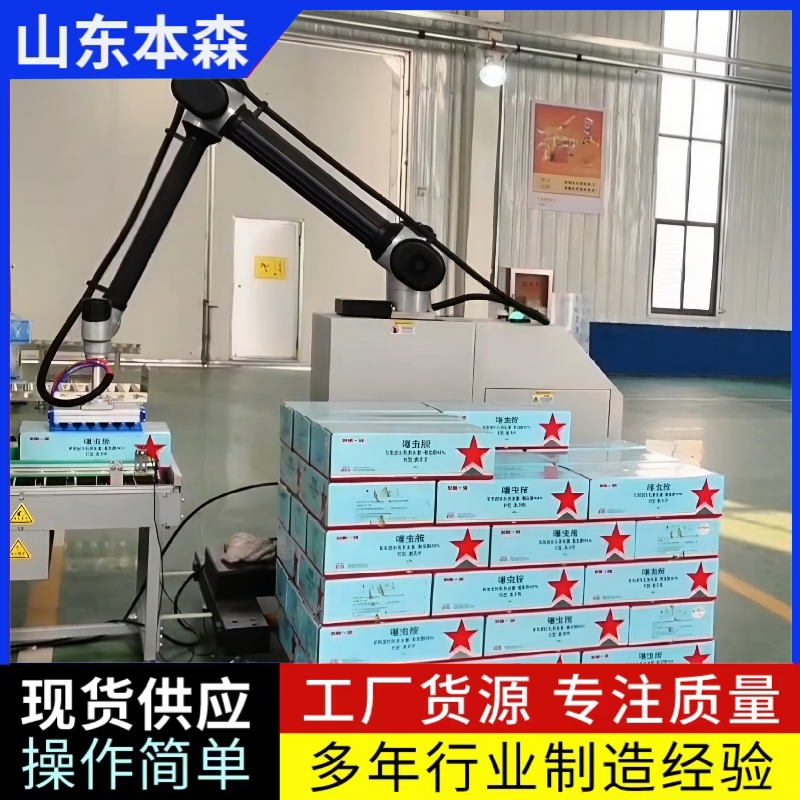 山东本森智能装备 农药箱搬运协作机器人码垛机是一种结合了协作机器人技术与自动化码垛功能的智能设备,适用于农药等化工行业的箱体搬运与码垛作业。以下是对该设备的详细介绍: